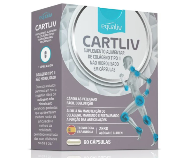 O Cartliv Colágeno Tipo 2 Equaliv 60 Cápsulas é um suplemento a base de colágeno tipo II não hidrolisado, que auxilia mantendo e restaurando a função das articulações. O consumo adequado de Equaliv CartLiv auxilia na manutenção do colágeno, mantendo e restaurando a função das articulações desgastadas por artrite reumatoide e osteodistrofia; atividades físicas repetitivas e prolongadas; sobrecarga nas articulações por excesso de peso, entre outros.